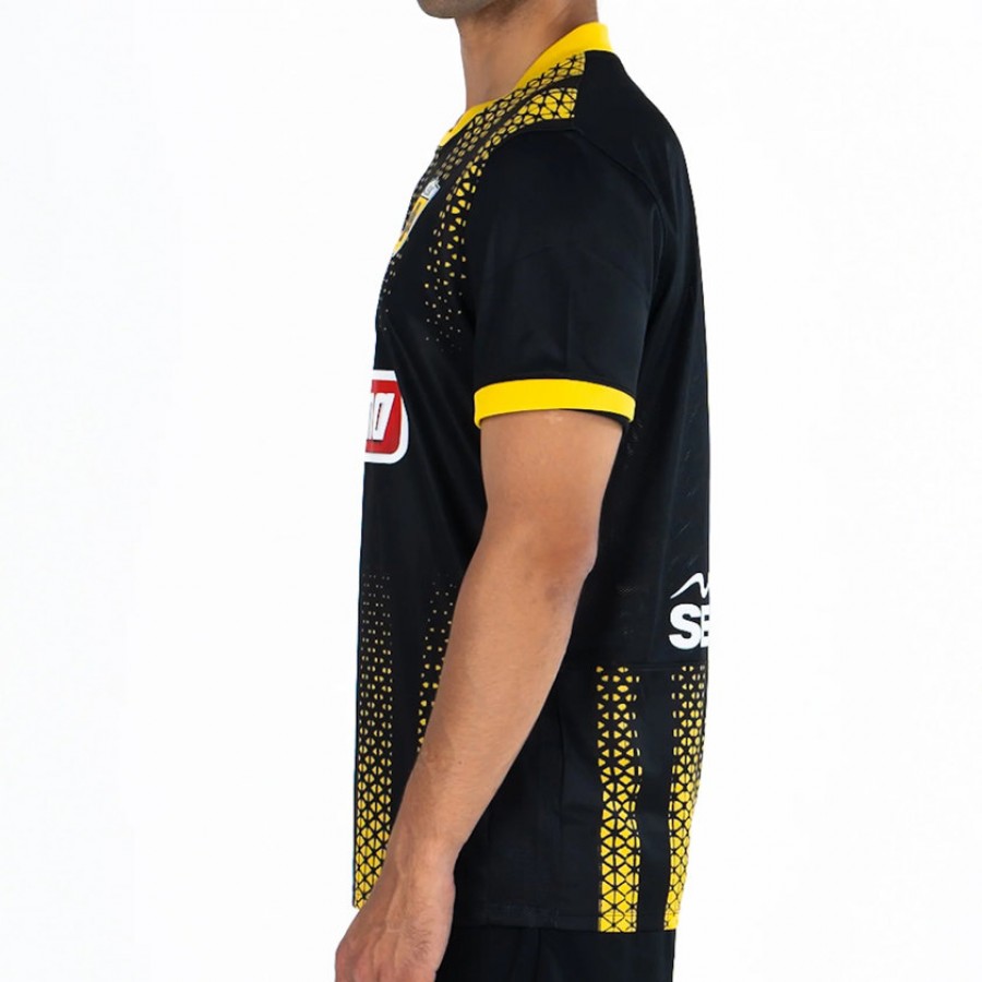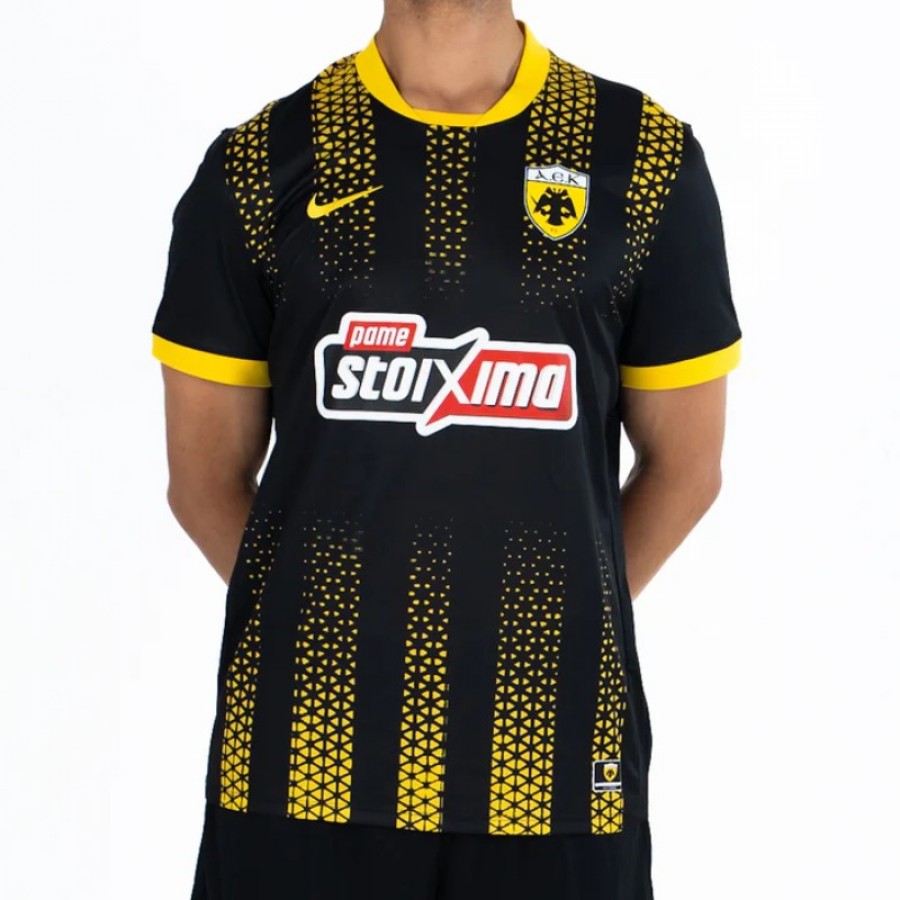 The Nike AEK Athens 2025-2026 away jersey is mainly black, just like this year's new home kit. However, the away shirt is based on standard Nike teamwear, making use of the new Academy template in yellow and black.
