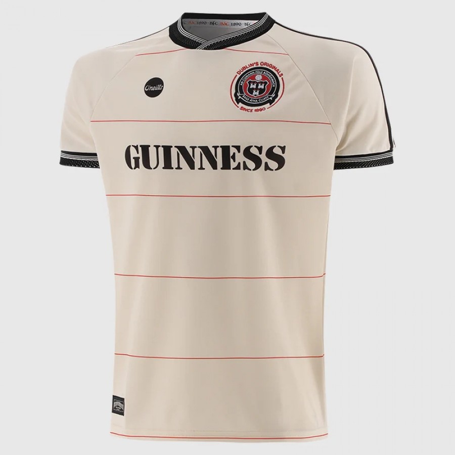 Our 2025 away shirt, celebrating two of the city’s most famous institutions. Featuring a Guinness logo from the 1980s, alongside an O’Neill’s logo from the same era, on a cream body with thin red pinstripes throughout, as well as a black and cream collar and sleeve trims, and an embroidered hem tag of the Ha’penny Bridge with Irish and English inscription.