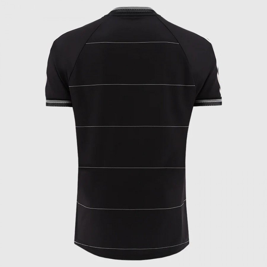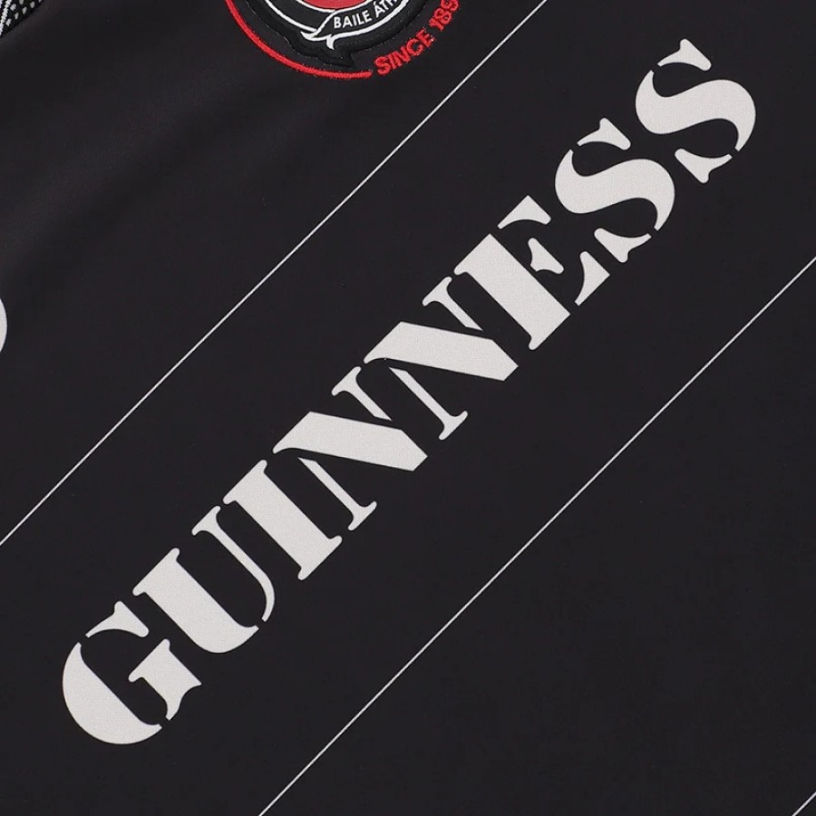 Our 2025 black (goalkeeper) away shirt, celebrating two of the city’s most famous institutions. Featuring a Guinness logo from the 1980s, alongside an O’Neill’s logo from the same era, on a black body with thin cream pinstripes throughout, as well as a black and cream collar and sleeve trims, and an embroidered hem tag of the Ha’penny Bridge with Irish and English inscription.