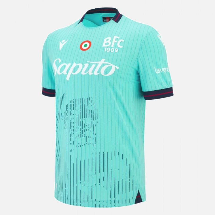 A blend of modern design and city identity: the new 2025/26 third jersey celebrates one of Bologna’s most iconic symbols, Neptune, depicted with an elegant tone-on-tone pinstripe pattern on a refined light blue base. The crew neck and red-and-blue sleeve cuffs recall the club’s colors, while the Macron Hero and the BFC 1909 crest stand out on the chest in white silicone print.