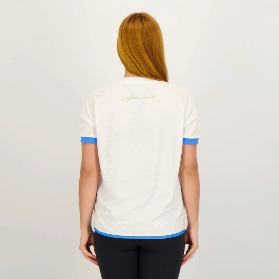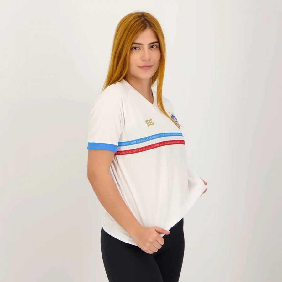 O Bahia é o mundo! Representing the famous Senhor do Bonfim ribbon, the Bahia Women's Home Jersey for 2023, created by Esquadrão, is the right choice for fanatical fans, with a white design with horizontal stripes, the piece brings the badge on the chest.