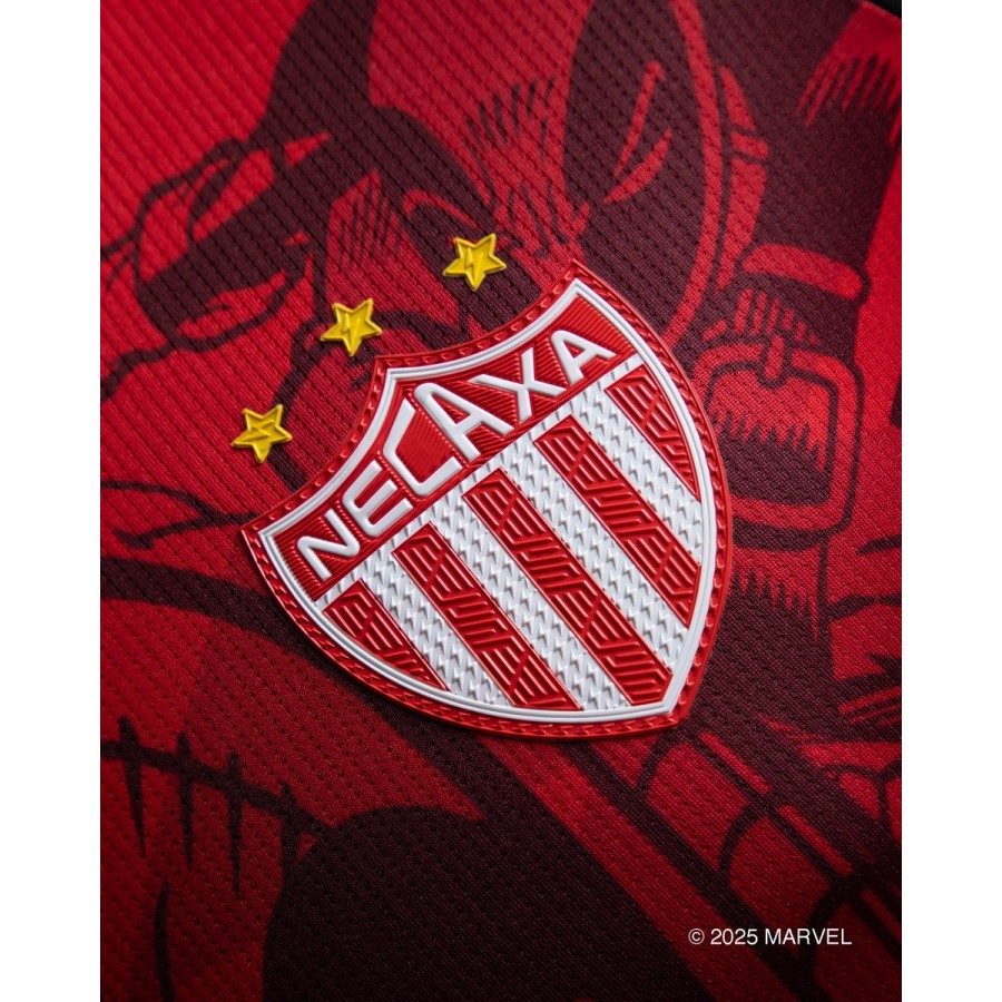 Club Necaxa turn heads for the 2025–26 season with a bold limited edition Deadpool football shirt, created in collaboration with Marvel. Fusing football culture with comic-book attitude, the design is built around Deadpool’s iconic red and black colourway, delivering a striking look that instantly stands out on and off the pitch. The shirt features dynamic graphic detailing inspired by the Merc with a Mouth, blended seamlessly with Necaxa’s traditional identity. Subtle comic-style textures and high-contrast accents give the jersey a premium, street-ready feel, while modern performance fabric ensures comfort and breathability whether worn for matchday, five-a-side or casual wear. Produced in strictly limited quantities, the Necaxa Deadpool 2025–26 shirt is a must-have for football collectors, Marvel fans and anyone who appreciates daring kit design. It’s a crossover that celebrates creativity, pop culture and the fearless spirit of Los Rayos in one unforgettable jersey.