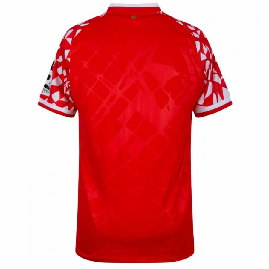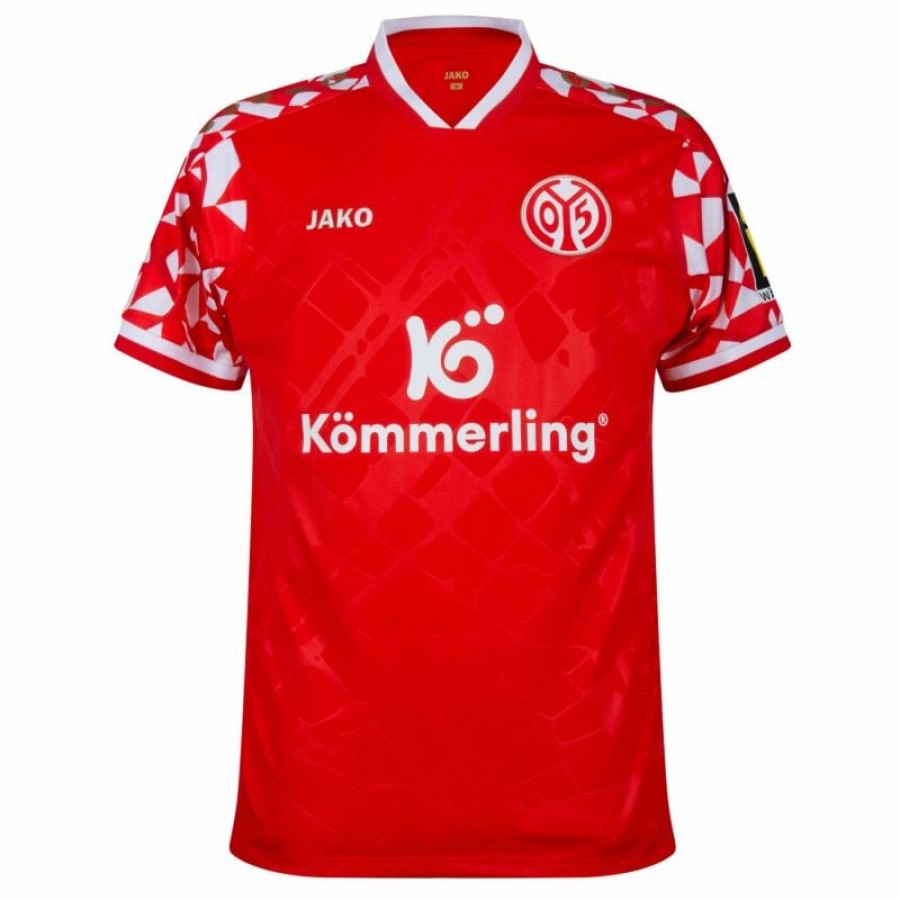 The Jako Mainz 25-26 home football shirt combines a classic red base with a unique embossed pattern, a topographic map of the city of Mainz. From a distance, the asymmetrical design appears abstract, but closer inspection reveals recognizable streets and landmarks from the Rhineland-Palatinate capital. Gold accents add a refined touch to the design, appearing on the shoulder trim, the edge of the Mainz 05 crest, and the JAKO logo, in a nod to Mainz’s nickname "Our Golden Meenz". The club's traditional double-wheel coat of arms is woven into the back of the collar. The sleeves feature a red-and-white pattern composed of subtle Mainz 05 crests, creating contrast while staying true to the club's identity.