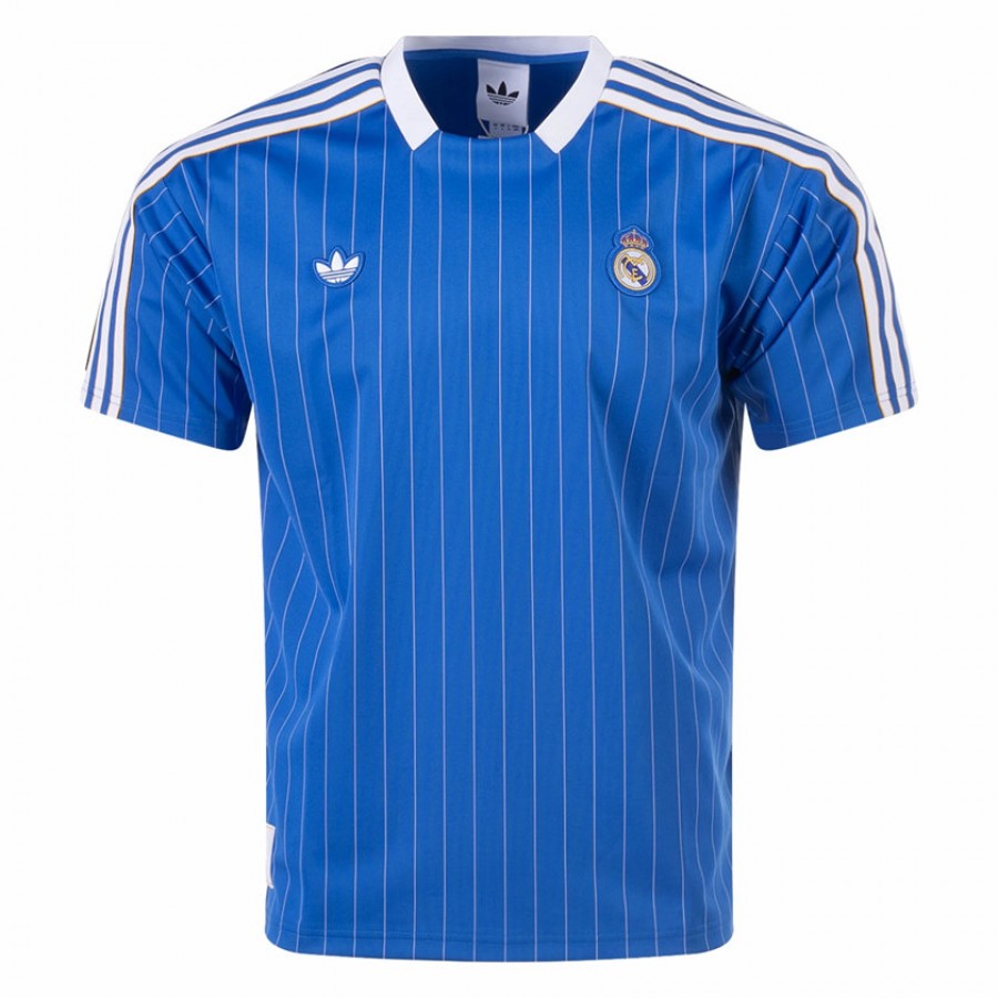 '80s football culture meets Los Blancos with this men's Real Madrid Icons Shirt from adidas Originals. In Blue Bird with white pinstripes and trims, this loose-fitting top is cut from recycled fabric. The famous 3-Stripes run down the shoulders from the crew neckline. Finished with the Trefoil badge and classic Real Madrid crest to the chest. Machine washable.