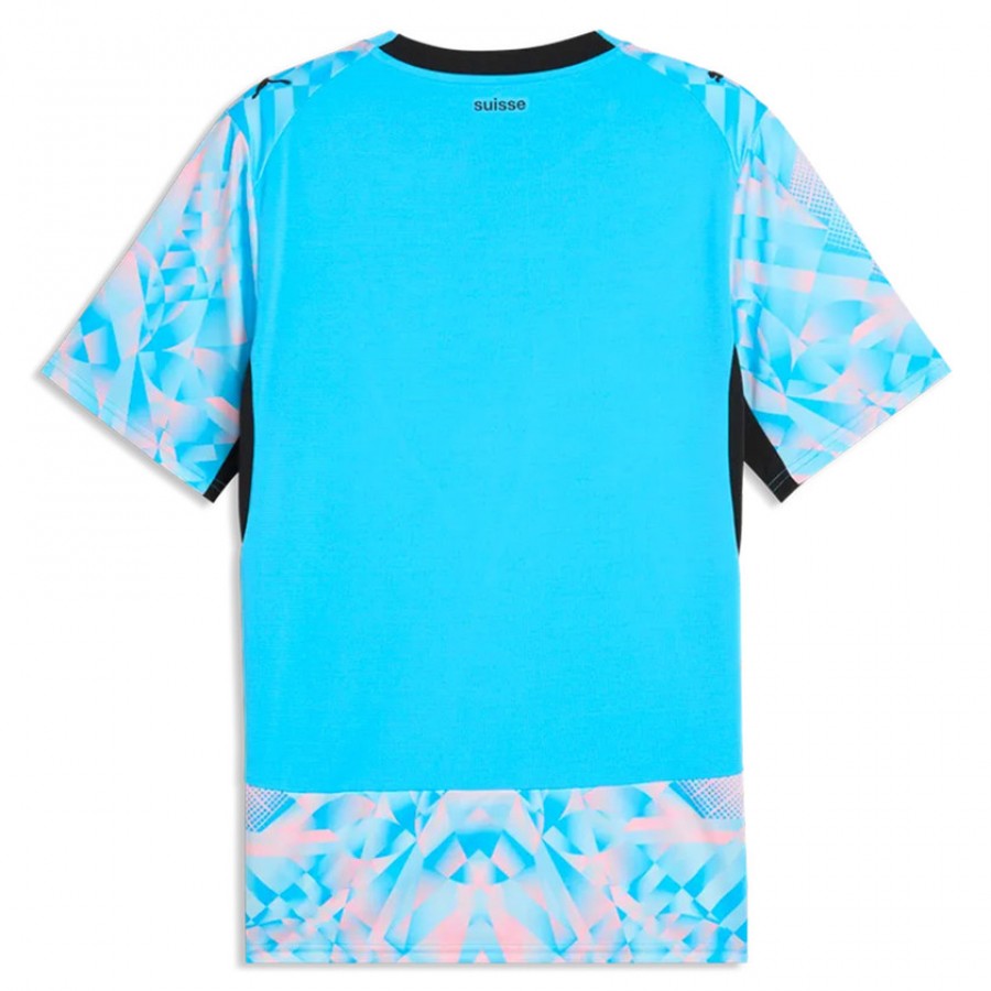 The Switzerland Mens Goalkeeper Jersey 2026 is produced by Puma for the 2026 season. It features a graphic design with a complex geometric pattern in sky blue and pink, complemented by black accents on the sides and collar.